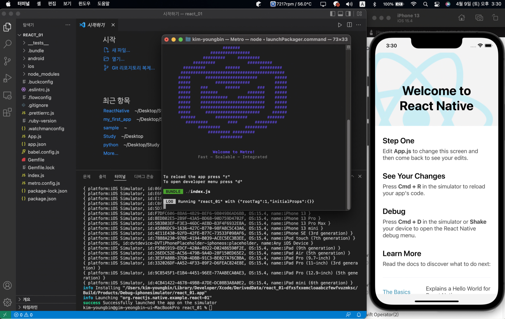 npm start를 따로 안하고 바로 npx react-native run-ios 명령어만 실행해도 npm start + react-native run-ios 를 하는 셈이 된다. 결론적으로 프로젝트 생성이랑 시뮬레이터 시작이 잘 안되던 것은 모두 npx를 사용하지 않고 이전 방법을 사용해서 그랬던 것 같다. 옛날 강의를 보는 사람들은 그대로 따라하지 말고 공식 문서나, 구글링 해서 최대한 최근 게시물들을 참고하는 것이 좋을 것 같다.