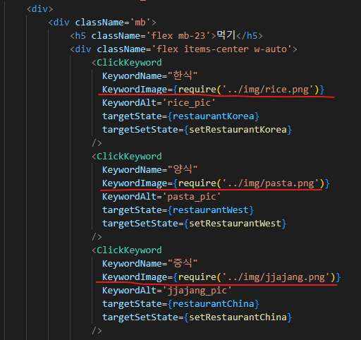 props로 경로 문자열만 전달해주고, ClickKeyword 컴포넌트에서 src={require(props.KeywordImage)} 로 받아왔다.