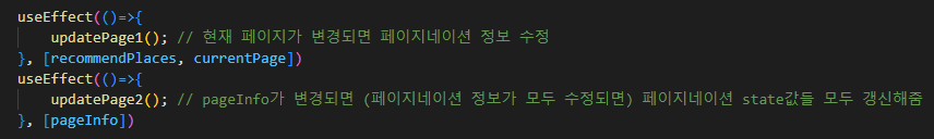 - 그 다음, 변경된 페이지네이션 값들을 pageInfo라는 객체 state에 세팅해주고, pageInfo에 의존성을 갖는 useEffect()를 실행하면서 해당하는 state값들을 모두 바꿔주었다.