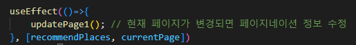 먼저 useEffect()의 의존성 배열에 따라 현재 페이지(currentPage)가 변경되거나, 추천 장소들이 불러와지면(recommendPlaces값이 변경되면) updatePage1() 함수가 실행된다.