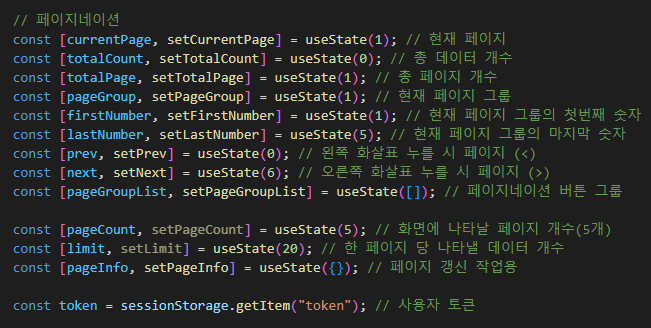 각 state의 기존 값들을 모두 별도의 var 변수에 넣어주고 해당 페이지네이션 변수값들을 순차적으로 갱신해준다.