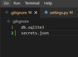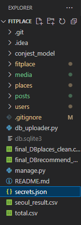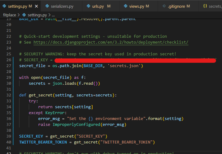 기존에 settings.py에 지정되어 있던 SECRET_KEY는 secrets.json 파일로 빼주었기 때문에 주석처리하였다.