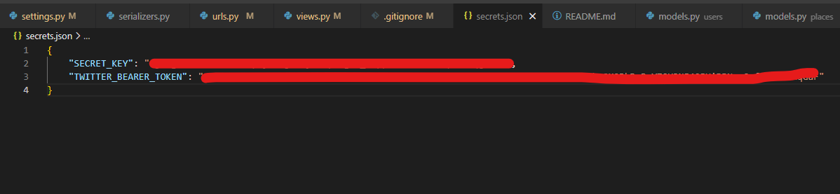 2. secrets.json 파일 안에 JSON 형식으로 API KEY 혹은 TOKEN 등을 입력해준다.