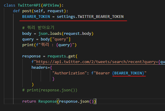 그래서 해당 API는 장고 백엔드 서버에서 호출하게 되었고, 팀원분께서 발급받은 BEARER_TOKEN 을 사용하였다.