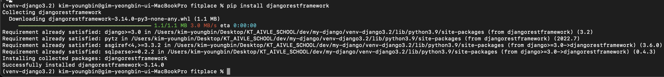 DRF를 사용해서 백엔드 REST API로 사용하는 프로젝트를 사용할 것이기 때문에 Django REST framework도 설치해준다.