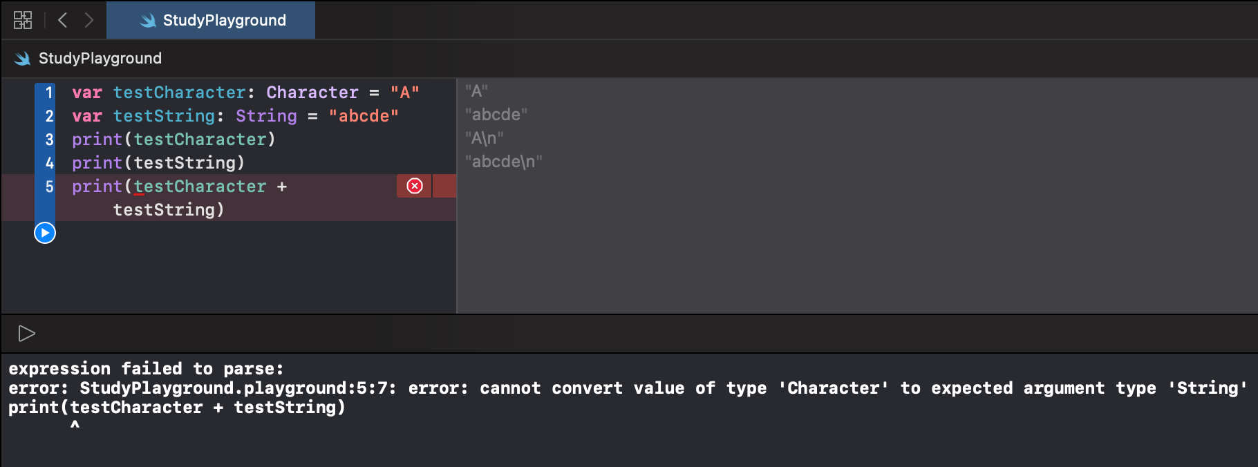 각각 Character와 String 타입인 두 변수를 더하면 오류가 난다.