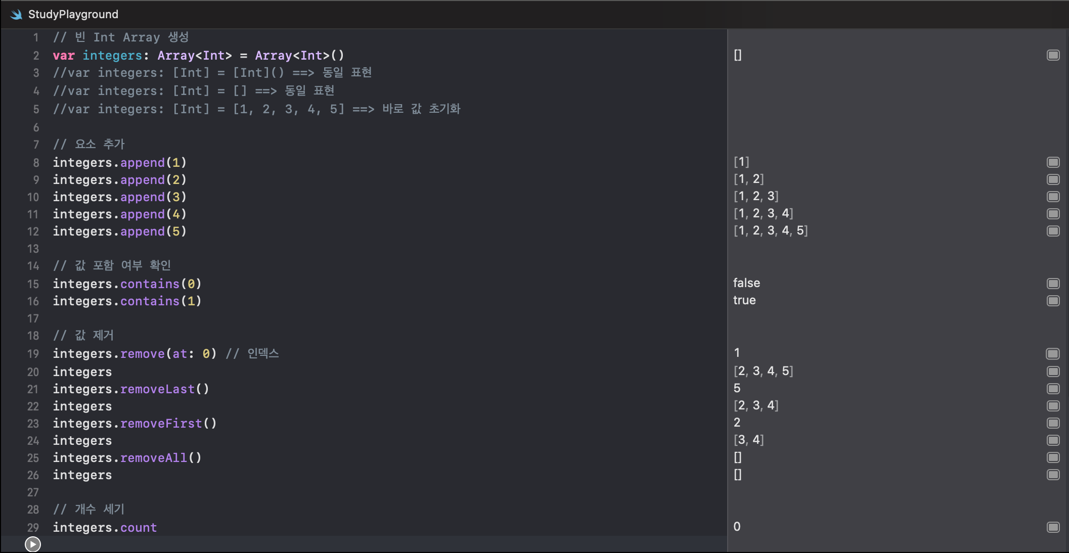 integers.remove(at: 0) // 인덱스