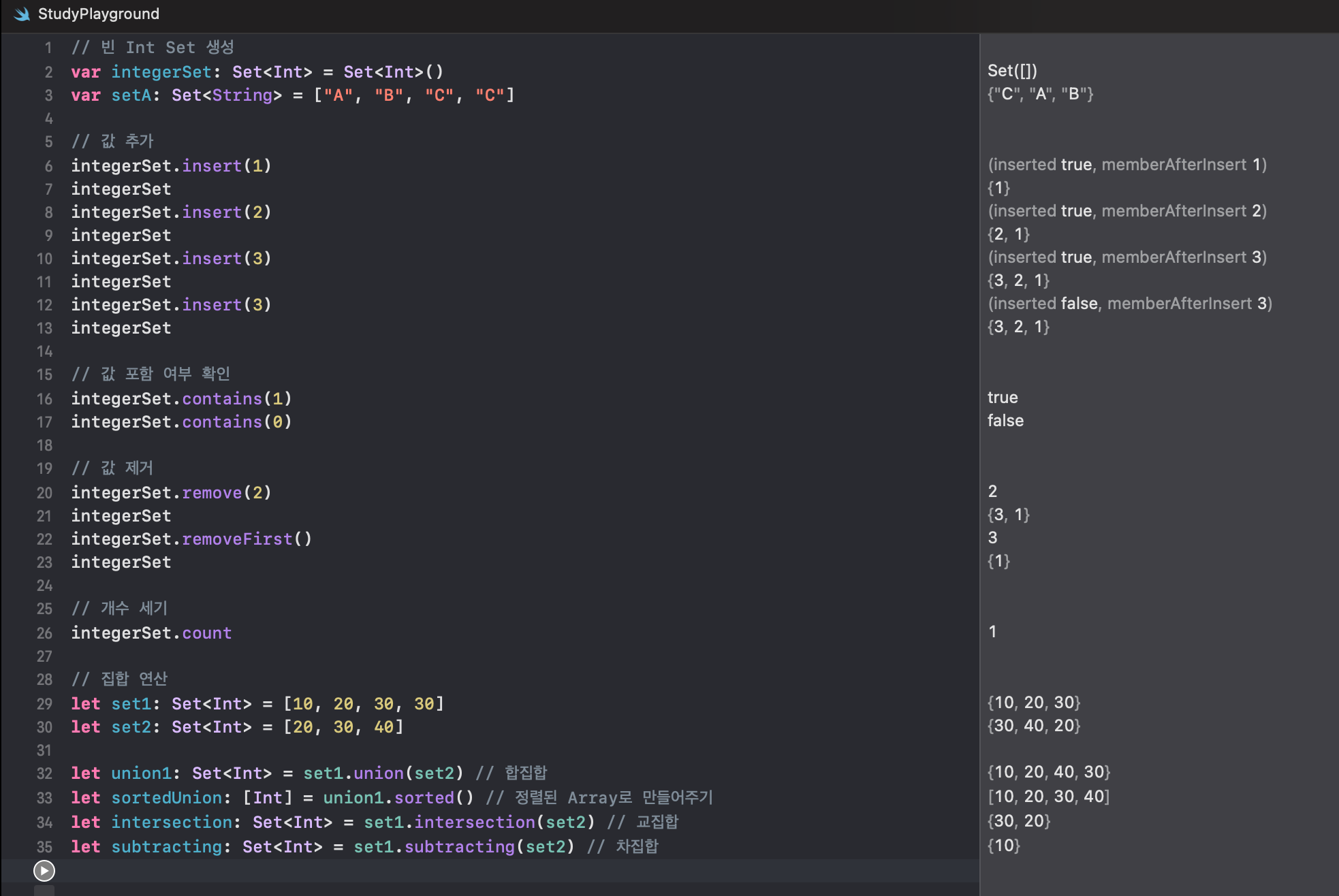 let sortedUnion: [Int] = union1.sorted() // 정렬된 Array로 만들어주기