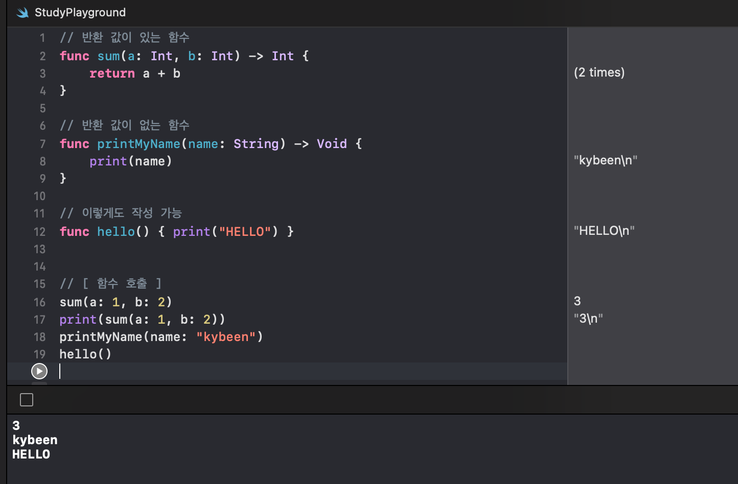 func 함수이름(매개변수1이름: 매개변수1타입, 매개변수2이름: 매개변수2타입 ...) -> Void {