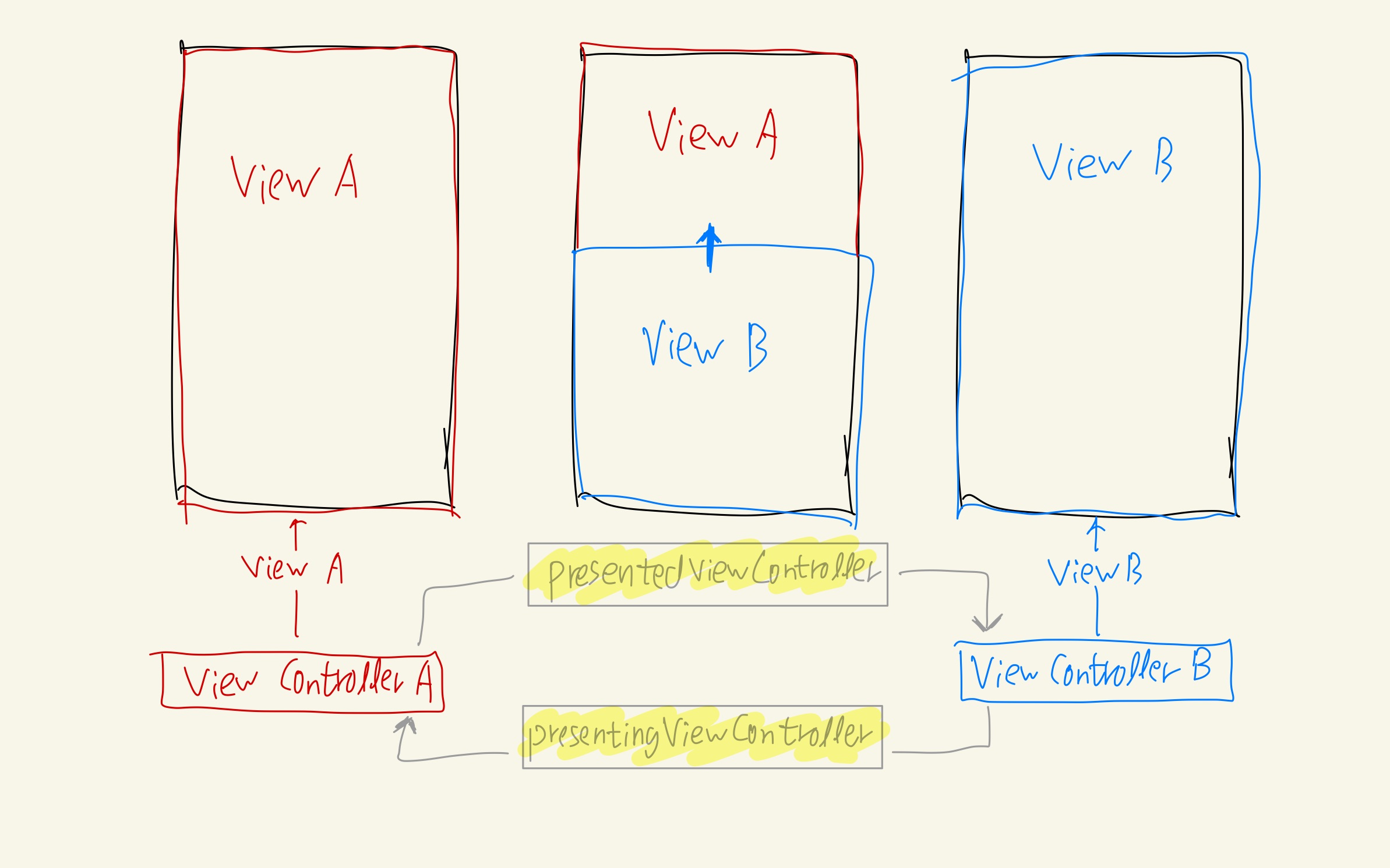 - presentedViewController : 기존 뷰 컨트롤러 -> 새로운 뷰 컨트롤러