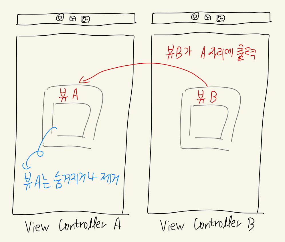 아래 그림처럼 다른 뷰 컨트롤러에 올려진 루트 뷰를 가져와 표시해주는 것이다.