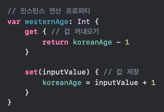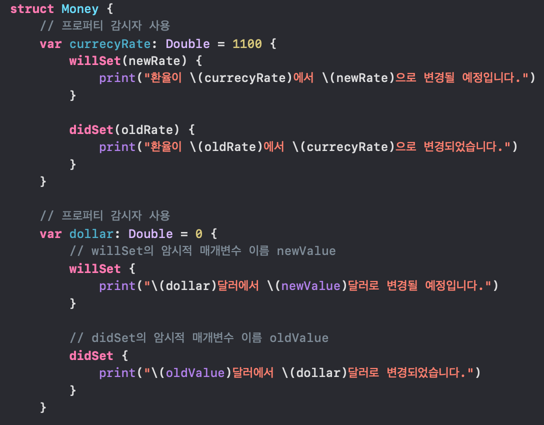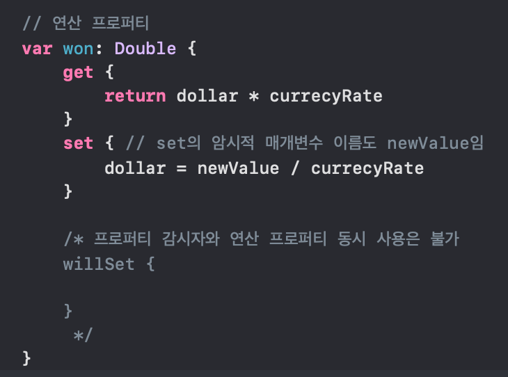 ※ 프로퍼티 감시자와 연산 프로퍼티 기능은 동시에 사용할 수 없다.