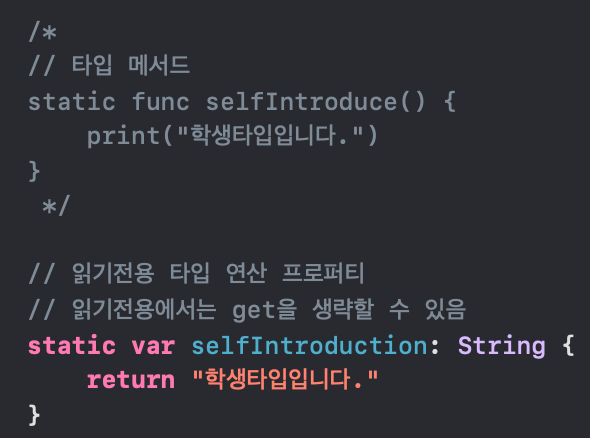 위에서 정의한 읽기 전용 인스턴스 연산 프로퍼티인 selfIntroduce와 이름이 같지만, 각각 인스턴와 클래스 자체에 대한 읽기 전용 프로퍼티라는 점이 다르기 때문에 각각 사용 가능하다.