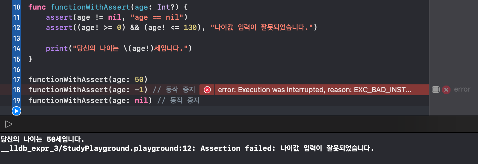 //functionWithAssert(age: -1) // 동작 중지