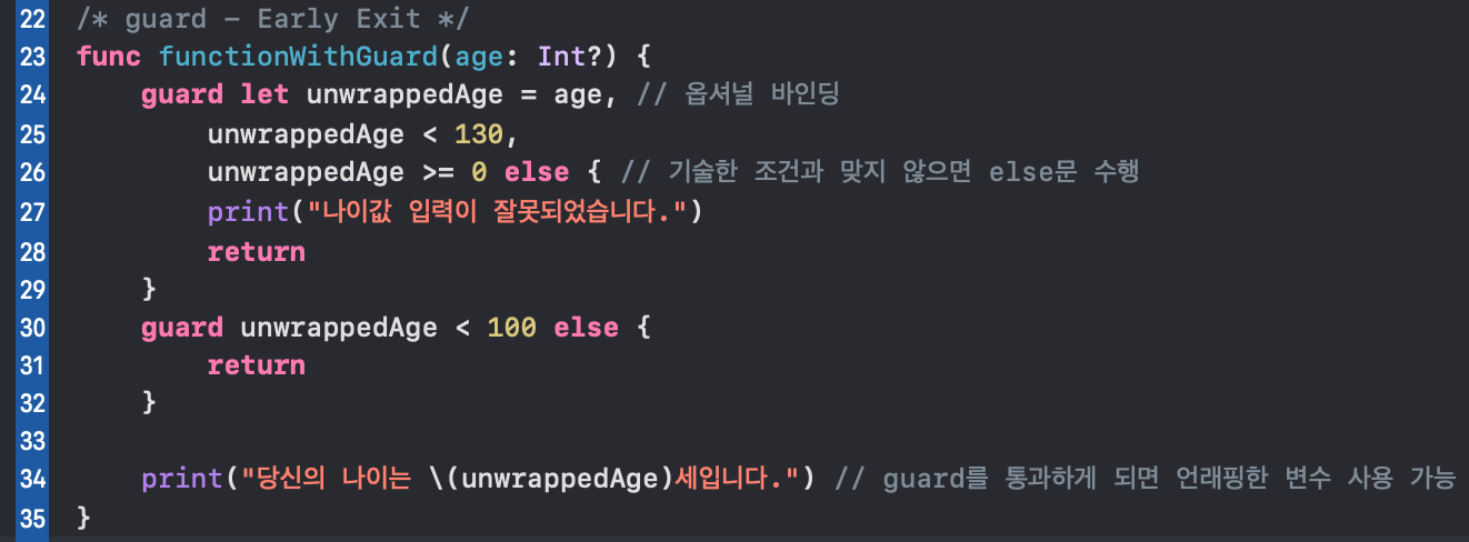 print("당신의 나이는 \(unwrappedAge)세입니다.") // guard를 통과하게 되면 언래핑한 변수 사용 가능