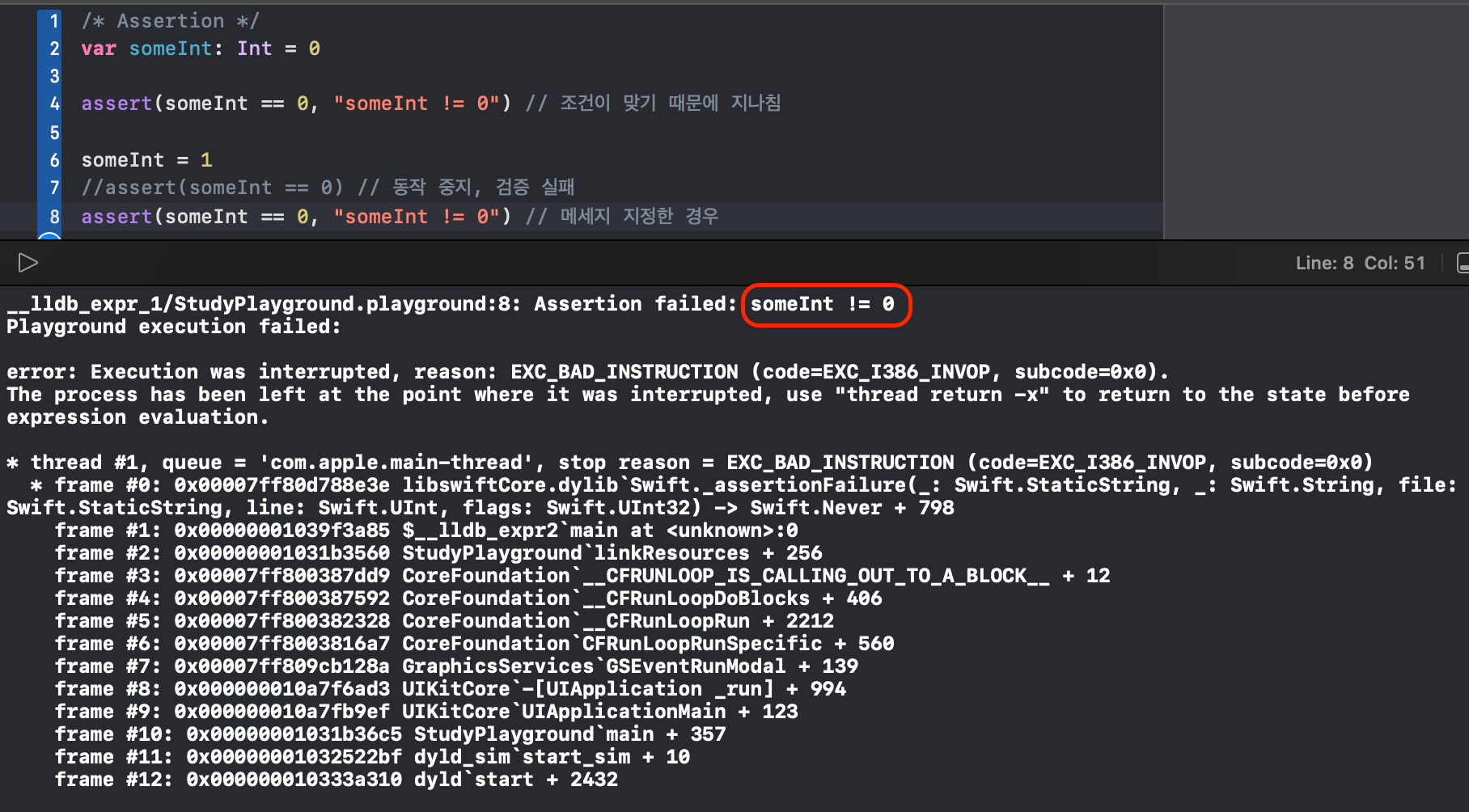 //assert(someInt == 0) // 동작 중지, 검증 실패