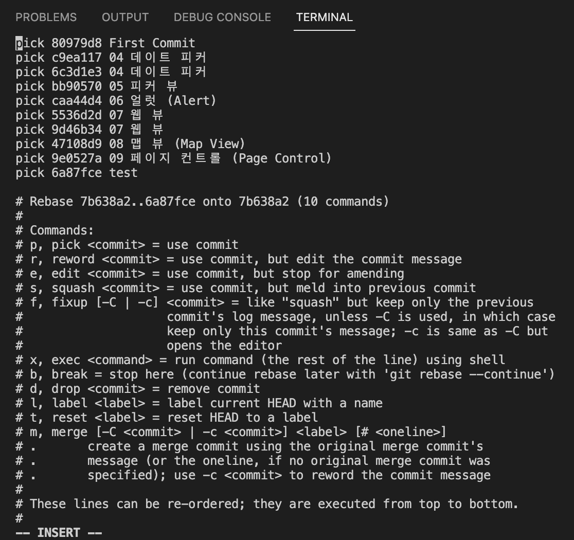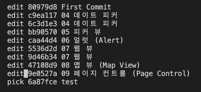 rebase를 해주고 나면 아래와 같은 vi편집기 창이 뜨게 된다.