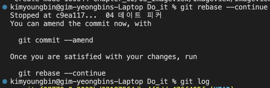 먼저 author명을 변경하고자 하는 커밋의 직전 커밋의 해쉬 코드로 rebase 해준다.