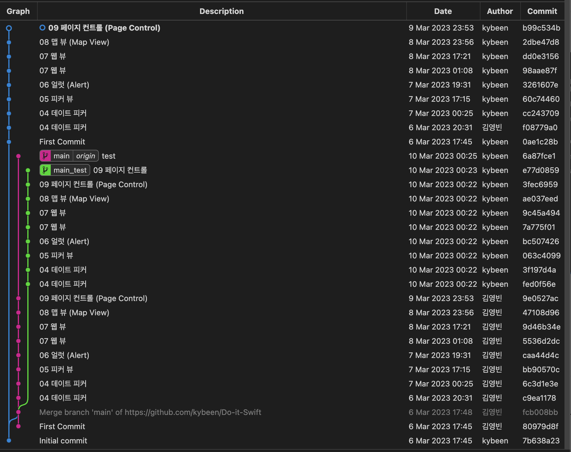 쭉 반복해준 결과, 커밋들의 author명이 바뀐 것을 볼 수 있다.