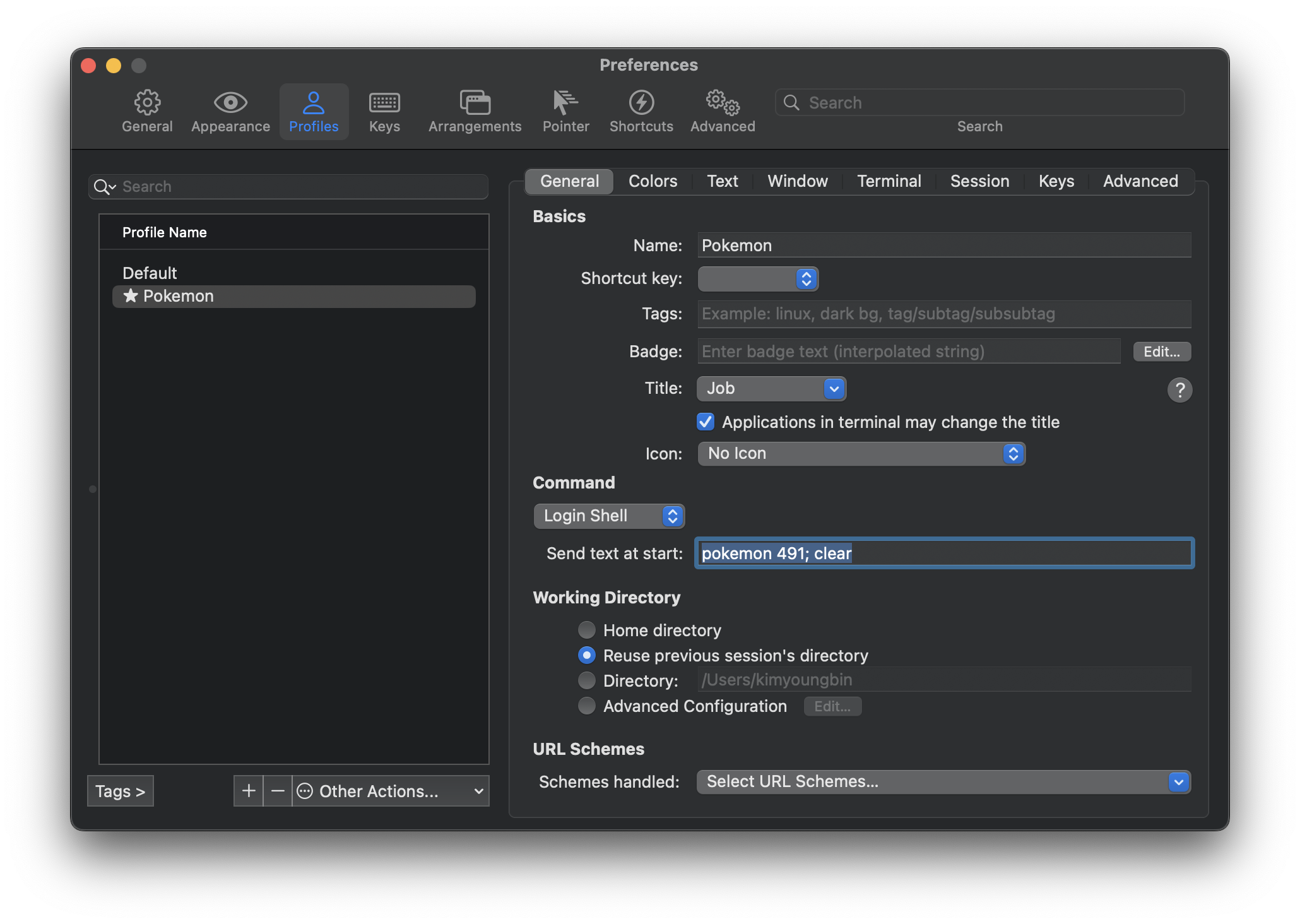 iTerm을 켤때마다 포켓몬 세팅이 돼있길 원한다면 시작 명령어 설정을 해주면 된다.