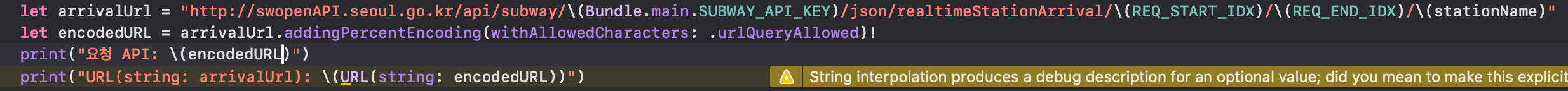 API 호출을 하려고 하는데 문제 없는 URL String을 URL 객체로 변환하니까 자꾸 nil이 반환되는 문제가 있었다. 저번에는 됐는데 왜 된거지