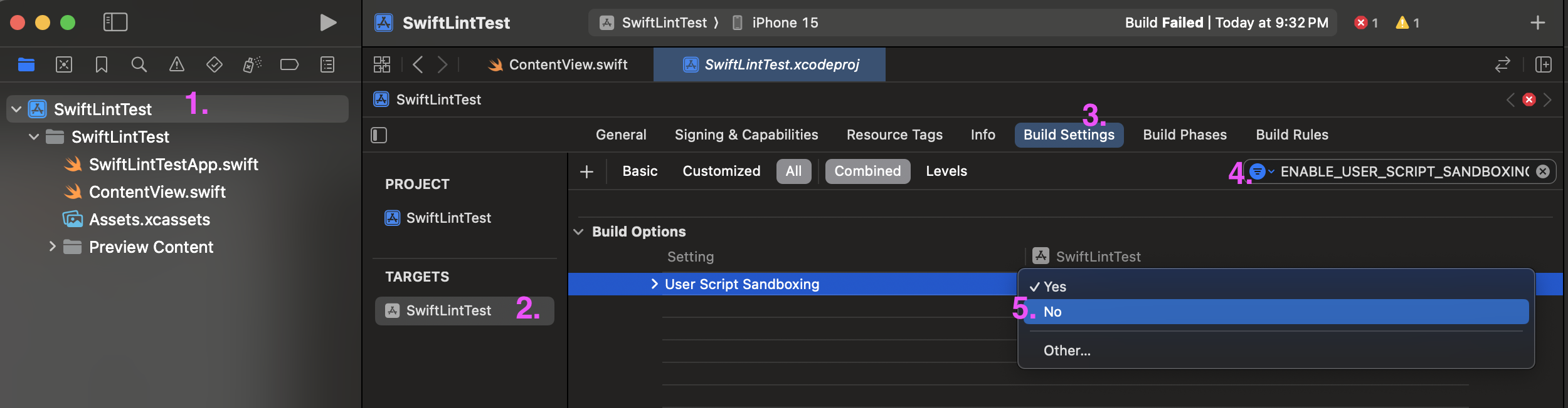 🚧 Xcode 15에서 - Failed with a nonzero exit code 또는 error: Sandbox: swiftlint(19427) deny(1) file-read-data. 오류
