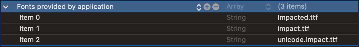 그리고 Info.plist에 Fonts provided by application 항목을 추가하여 적용하려는 폰트들을 아이템으로 추가해줍니다.