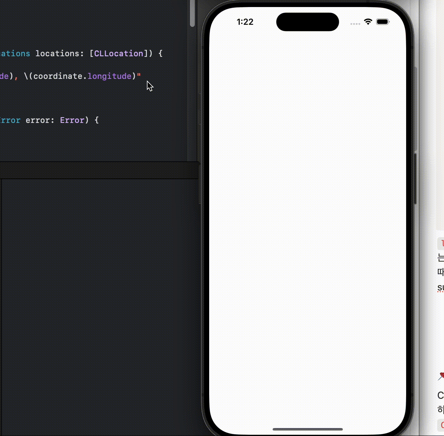 화면의 버튼을 클릭했을 때 locationManager가 requestLocation()를 호출하고, 델리게이트 메서드에서는 위치 데이터를 받아서 화면에 표시하도록 코드를 작성해 보았습니다.