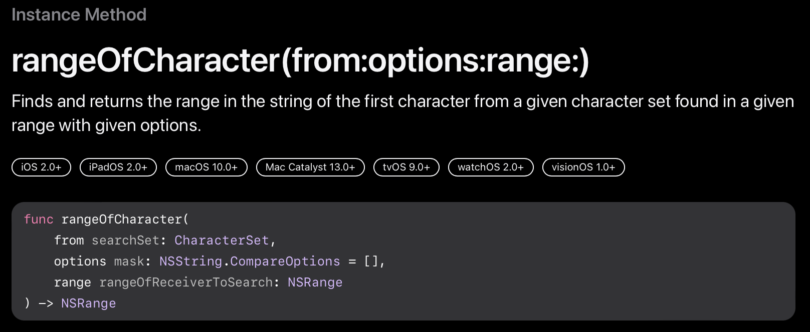 해당 메서드는 파라미터로 설정한 옵션에 따라 문자열을 탐색하며, 문자열의 주어진 범위 내에서 주어진 문자 집합에 해당하는 범위를 구해줍니다. 가장 먼저 발견한 곳의 range만 반환하게 되며, 반환 타입이 옵셔널이기 때문에 매칭되는 곳이 없으면 nil을 반환합니다.