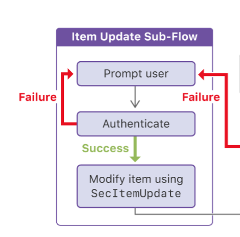 - 그러면 앱은 다이어그램의 오른쪽 흐름과 같이 사용자에게 새로운 인증을 요청하게 되고, 새 credential을 검증한 뒤에 SecItemUpdate(_:_:) 함수를 호출하여 키체인에 있는 기존 정보를 수정하게 됩니다.