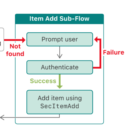 아래 다이어그램은 인터넷 비밀번호를 Keychain Item으로 저장하는 경우의 플로우입니다.