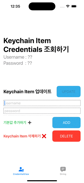 아래처럼 간단하게 키체인의 CRUD 작업을 테스트할 수 있는 앱을 만들어봤습니다.