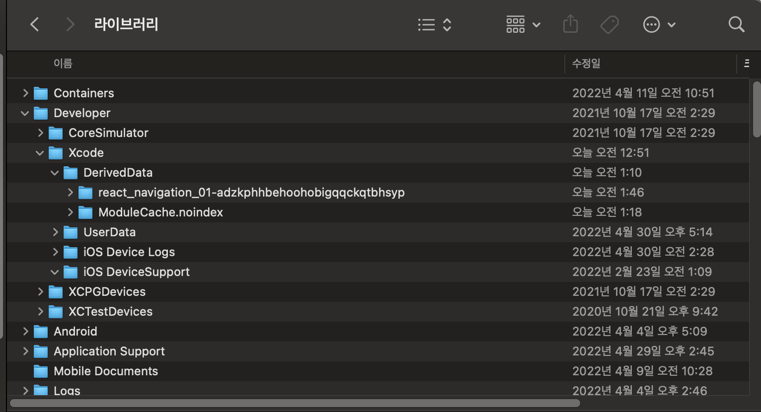 Xcode를 업데이트 하고 나서 문제가 있었고, ios 시뮬레이터를 돌릴 때만 멈췄기 때문에 xcode 문제일 것 같다는 생각이 계속 있었다. 뭔가 버전이 바뀌면서 이전에 빌드된 정보랑 충돌 같은게 생기는게 아닐까 하는 생각에 xcode의 빌드 내역? 들이 저장되는