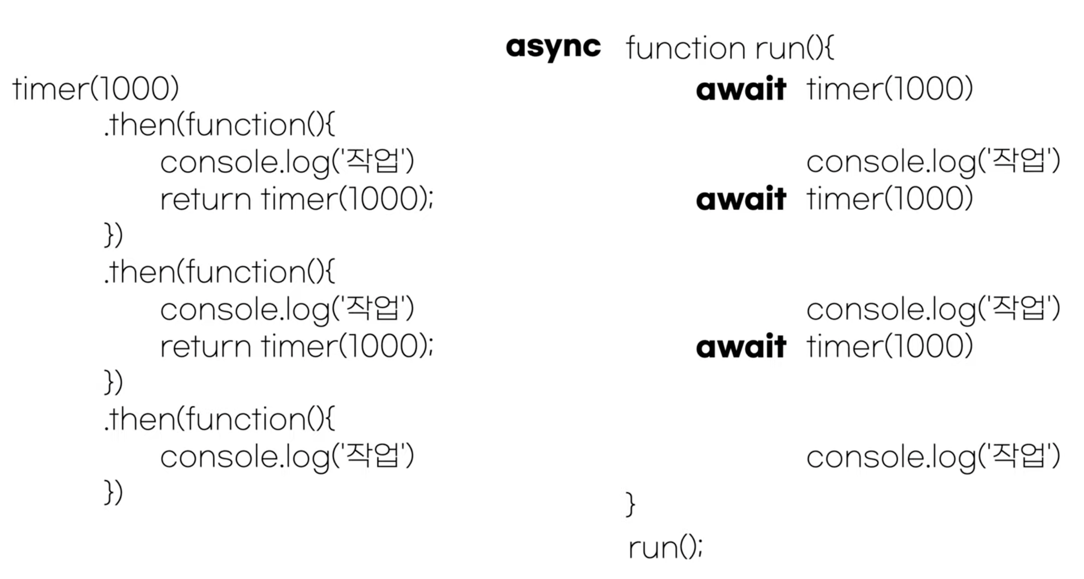 오른쪽은 이러한 왼쪽의 코드와 완전히 동일하게 동작하는 코드이고, async와 await라는 키워드를 사용하여 동기적인 방식으로 코드를 작성하지만 비동기적 처리를 할 수 있게 해준다.