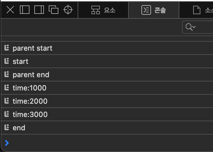 start를 출력하고 1초 뒤, 그 이후 2초 뒤, 그 이후 3초 뒤에 시간을 출력하고 end를 출력하는 코드이다.