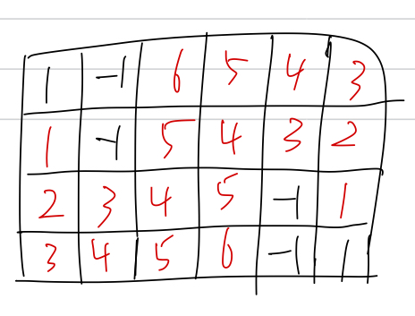 첫 줄에는 상자의 크기를 나타내는 두 정수 M,N이 주어진다. M은 상자의 가로 칸의 수, N은 상자의 세로 칸의 수를 나타낸다. 단, 2 ≤ M,N ≤ 1,000 이다. 둘째 줄부터는 하나의 상자에 저장된 토마토들의 정보가 주어진다. 즉, 둘째 줄부터 N개의 줄에는 상자에 담긴 토마토의 정보가 주어진다. 하나의 줄에는 상자 가로줄에 들어있는 토마토의 상태가 M개의 정수로 주어진다. 정수 1은 익은 토마토, 정수 0은 익지 않은 토마토, 정수 -1은 토마토가 들어있지 않은 칸을 나타낸다.