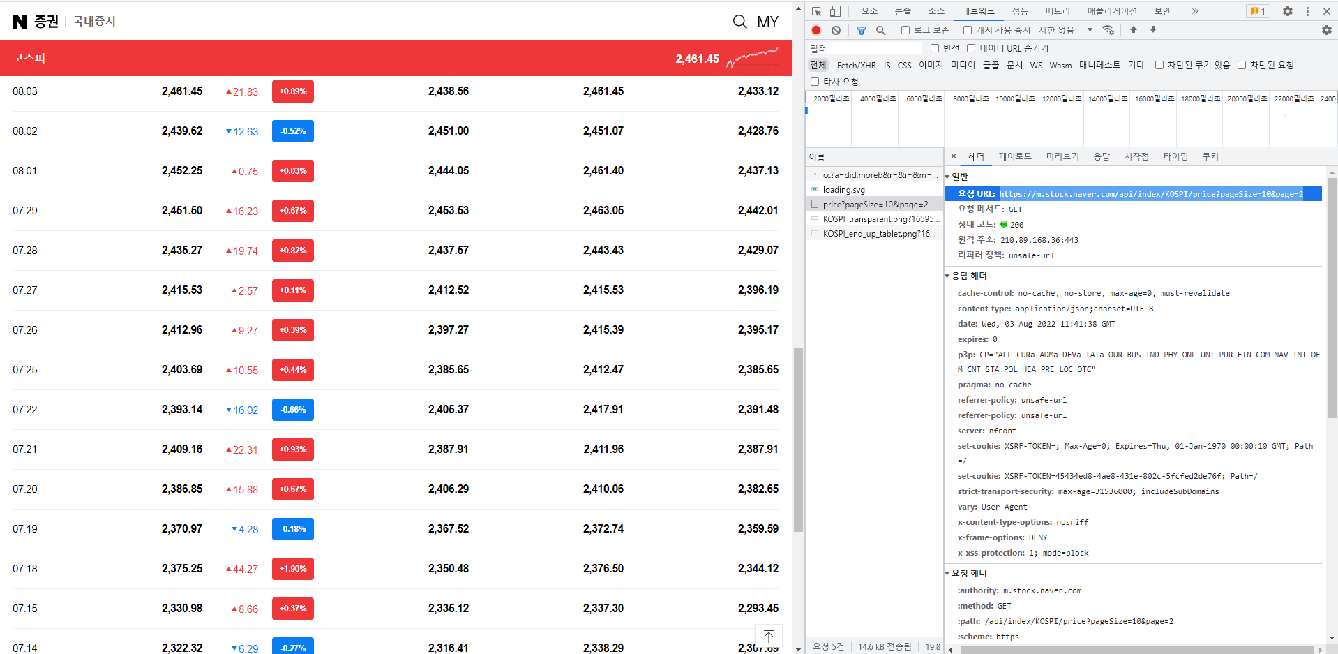 데이터 요청 URL을 찾아내기 위해 일별 시세 항목의 [더보기] 버튼을 눌렀을 때 크롬 개발자 도구의 네트워크 탭에서 요청이 이루어지는 것을 확인해본다.