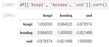- kospi - usd : -0.878 : -1과 가까우면 강한 음의 상관관계
