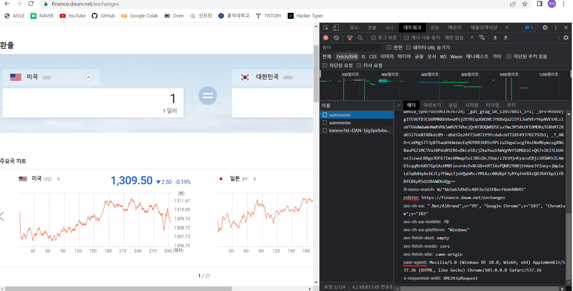 다음으로 다음 금융 사이트의 환율 정보를 수집했는데 여기서는 get 요청을 사용하지만 headers도 별도로 추가해 주어야 했다. 다음 금융에서는 네이버 금융과 다르게 헤더에 user-agent와 referer값을 넣어서 요청을 보내주어야 데이터를 응답으로 받을 수 있었다.