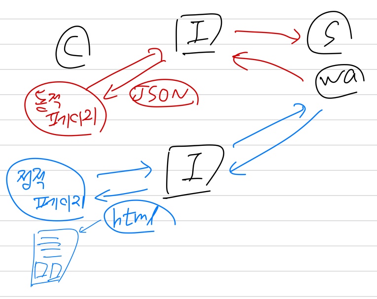- 동적페이지 : URL 변경 없이 웹 페이지 데이터 수정 (데이터를 JSON 포맷으로 서버에서 받아옴) --> 주로 API 사용할 때
