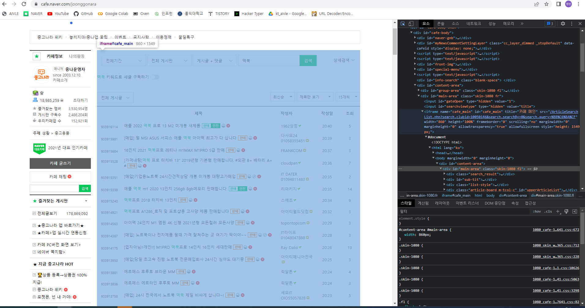 다음으로 네이버 중고나라 게시글 데이터를 수집했는데 다른 실습과 다른 점은 중고나라 게시물들이 iframe 태그 안에 들어 있기 때문에 브라우저 드라이버의 프레임을 이동시켜주어야 했다는 것이다.