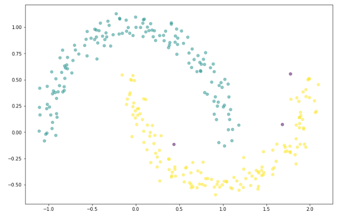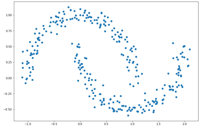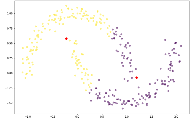아래와 같은 식의 데이터 분포일 경우, 위아래 초승달 모양의 2가지 군집으로 나누는 것이 가장 좋다.