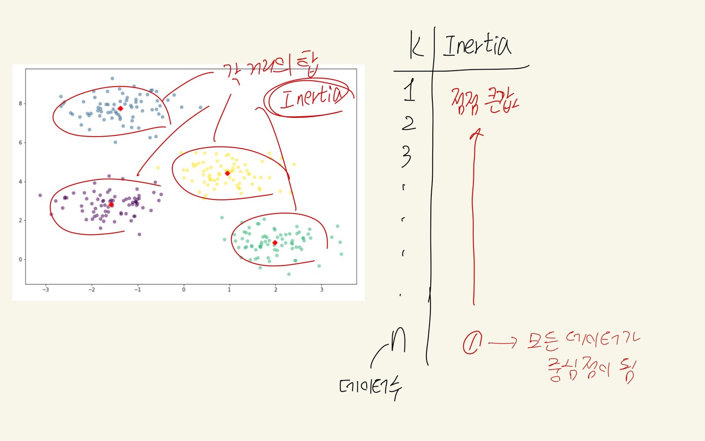 - K값이 점점 데이터의 수와 가까워지면 Inertia값은 점점 작아지고, K가 데이터의 수 n과 같아지면(K=n) 모든 데이터가 중심점이 되기 때문에 inertia값이 0이 된다