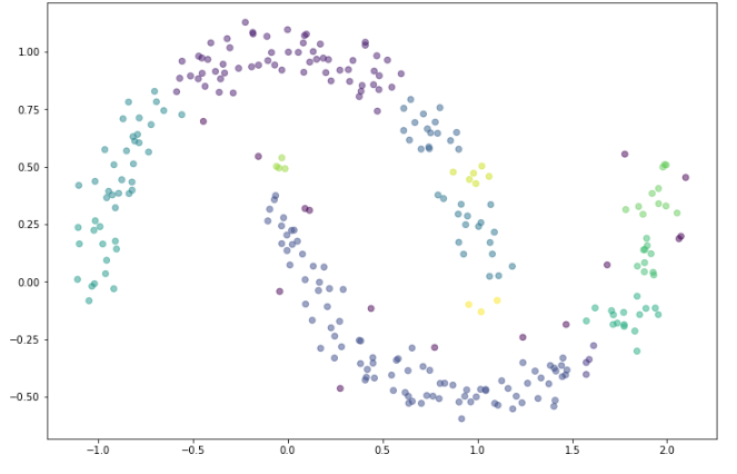 모델 선언 함수 DBSCAN()에서 eps=0.2, min_samples=3 으로 옵션을 주고 다시 확인해보면