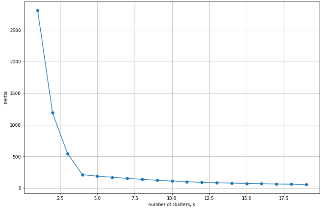 k값 별로 inertia값을 시각화해보았고, k=4 정도가 적절한 지점이라는 것을 판단해볼 수 있다.