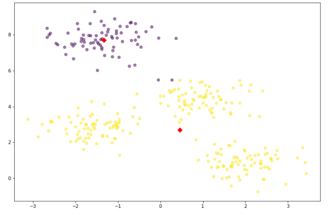 그러나 K-means로 2개의 군집을 나눠주면 아래와 같은 결과를 얻게 된다.
