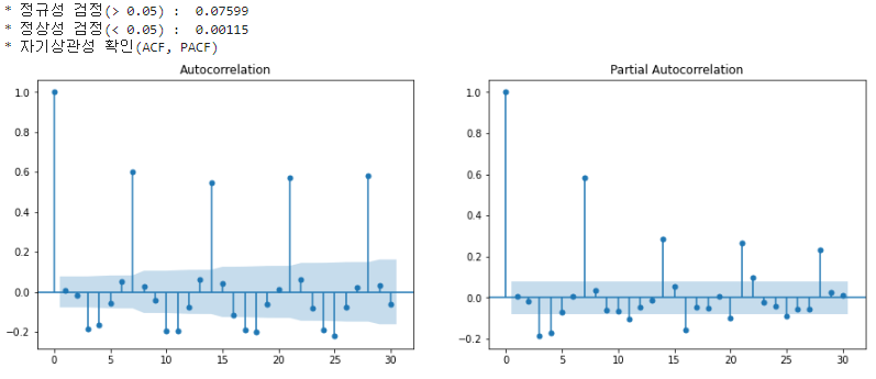 plot_acf(), plot_pacf()를 사용해서 ACF, PACF의 자기상관함수 그래프를 그릴 수 있다.