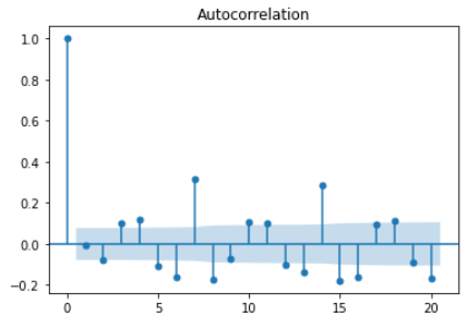다른 값들은 모두 다른 시점들의 상관계수이고, 파란색 경계영역(임계값) 안에 있는 값들은 자기상관성이 없다고 볼 수 있고, 영역을 벗어나는 값들은 잔차에 패턴이 남아있기 때문에 자기상관성이 있다고 볼 수 있다.