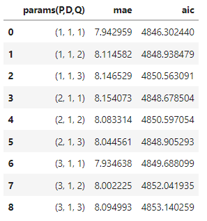 위의 방법과 동일하게 P,D,Q의 튜닝을 해준 뒤, mae와 aic의 결과를 확인해보았더니