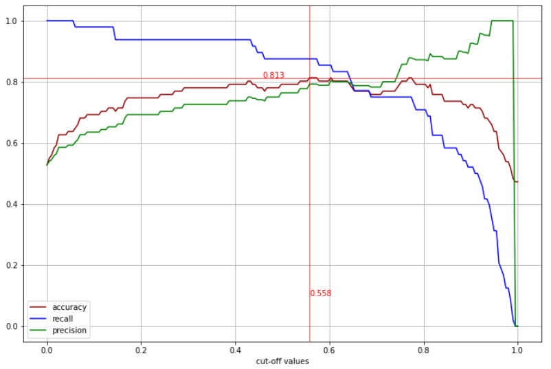 - cut-off 값에 따른 Accuracy, Recall, Precision 값을 그래프로 확인